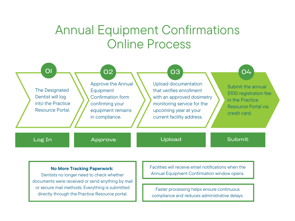 Dentists will pay the annual facility registration fee directly through the portal using a credit card.
