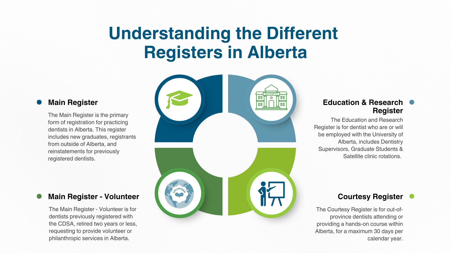 The Main Register is the primary form of registration for practicing dentists in Alberta. This register includes new graduates, registrants from outside of Alberta, and reinstatements for previously registered dentists.