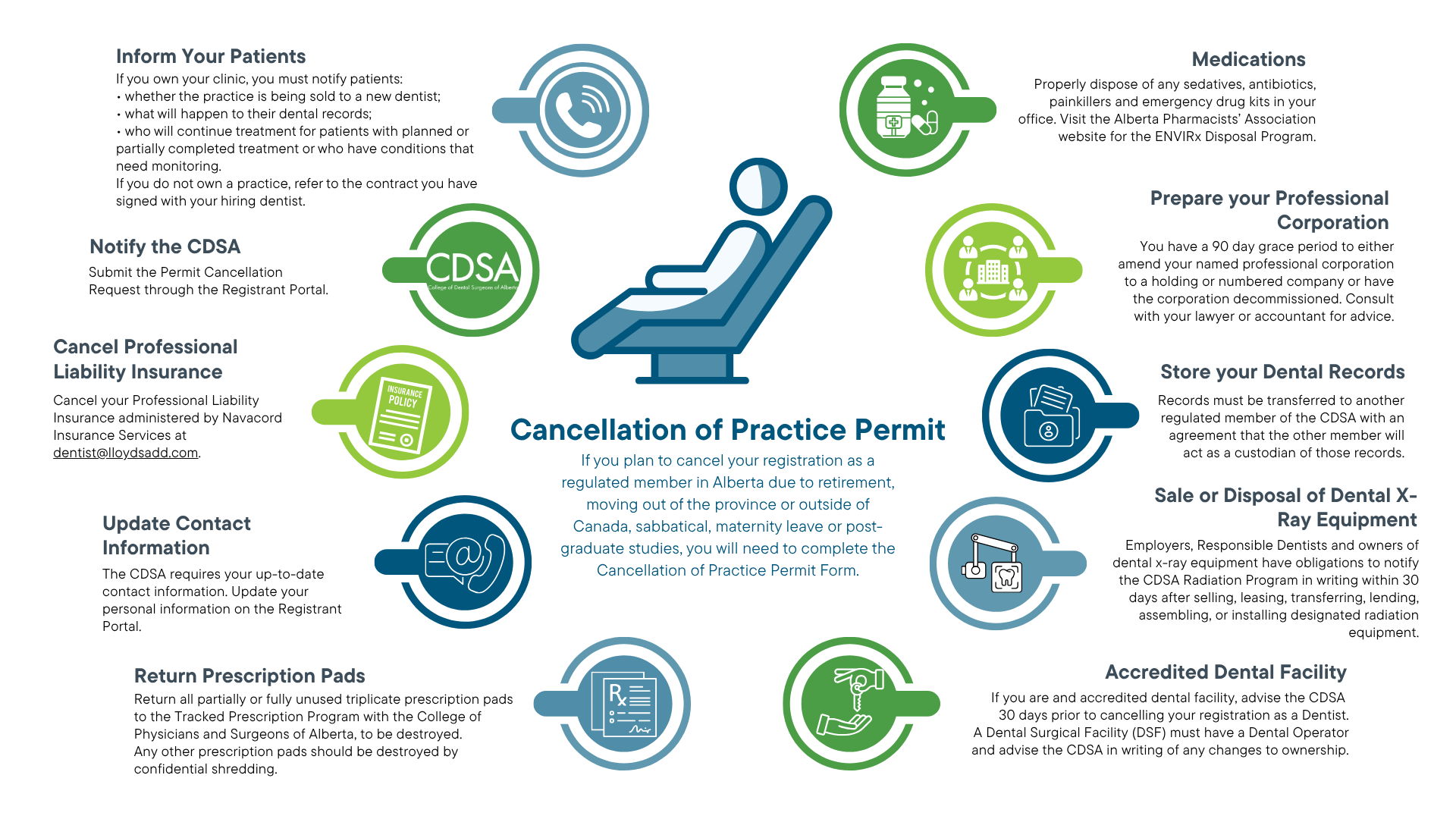 If you plan to cancel your registration as a regulated member in Alberta due to retirement, moving out of the province or outside of Canada, sabbatical, maternity leave, or post-graduate studies, you will need to complete the permit cancellation request on the Registrant Portal. Until this signed form is received at the office of the College of Dental Surgeons of Alberta (CDSA), you are considered a member with the same responsibilities and obligations of meeting continuing competency requirements, maintaining malpractice insurance and payment of annual dues. As part of your cancellation, you will need to cancel your Professional Liability Insurance administered by Navacord Insurance Services. You can contact Navacord directly at dentist@lloydsadd.com